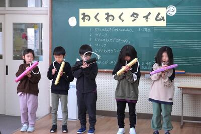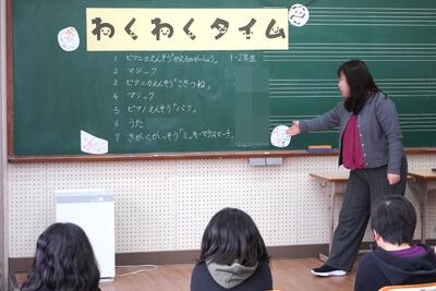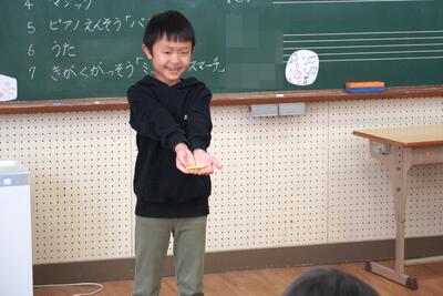 今日の中休みに、わくわくタイムを行いました。始業式の時に校長先生から「やったことのないことに挑戦しよう」とのお話があり、自分の得意な事やみんなに披露したいことを募集しました。今回は4人の児童が、マジックや楽器・歌を発表してくれました。ちょっと照れながらもしっかりと発表ができました。とても楽しい時間を共有することができました。第2弾が楽しみです。